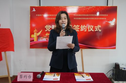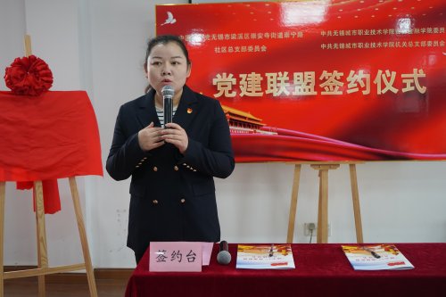 崇宁路社区党总支书记余懿致欢迎辞,向与会人员介绍社区发展近况。她指出,崇宁路社区党总支先后与第一女子中学、无锡法院、东林书院等单位开展党建共建活动,有效整合资源,提升为民服务水平,获得党员群众一致认可。此次能够与我校贸金党总支、机关党总支结为党建联盟单位,深感荣幸。社区会以此次签约为契机,做到工作联动、活动联办、服务联合、党员联育、阵地联建、品牌联创,进一步深化党建共建内涵,落实党史教育专题活动各项要求,共同为庆祝建党100周年争当表率、争做示范、走在前列。