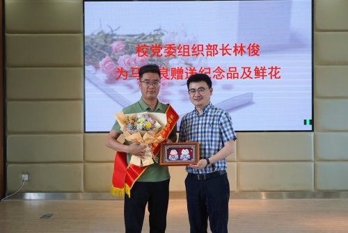 组织部长林俊代表学校为马宗良同志赠送纪念品及鲜花。他希望马主任能把无锡人民的深情厚谊带回青海,希望东西部两校的友谊地久天长。
