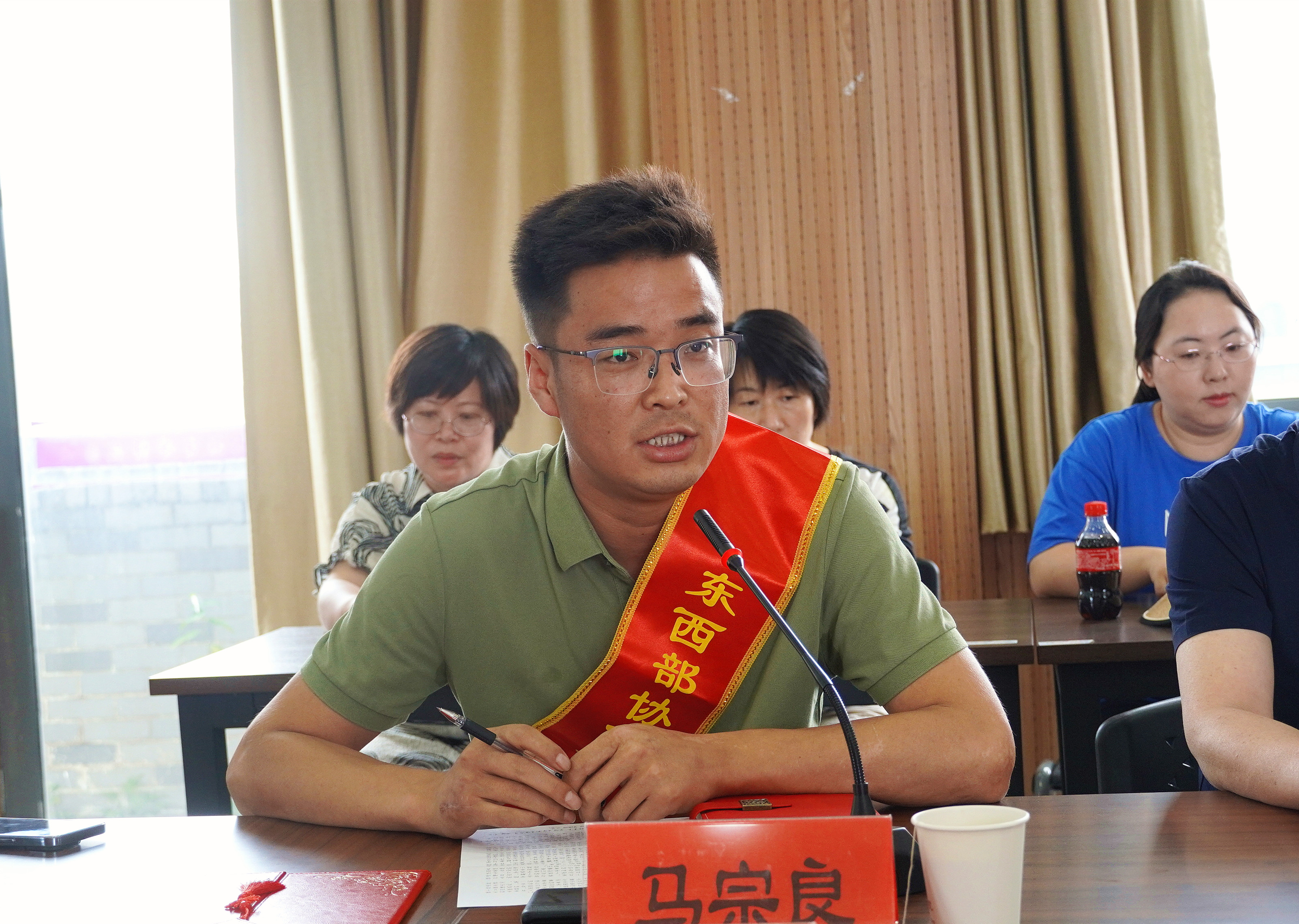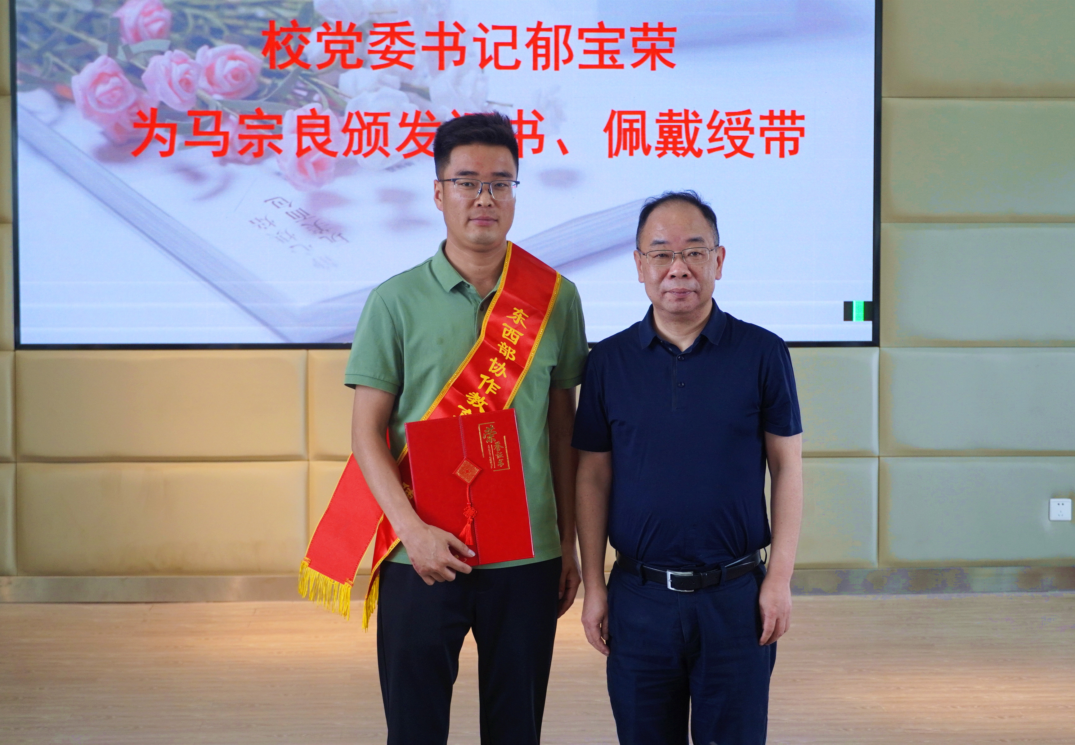 校党委书记郁宝荣为马宗良同志颁发“东西部协作教育文化交流使者”证书,并为其佩戴绶带。郁书记回顾了马宗良在我校的现实表现,对他提出了殷切的期望,送上了美好的祝福。郁书记表示,今后学校将持续加强东西部协作交流,实现资源共享,深入开展结对帮扶,开启东西部协作教育新篇章。郁书记要求贸金学院全体教师要与青高职财经系在党的建设、教育教学、人才培养、校企合作、学生工作等各方面加强合作交流,共同搭建东西互助平台,为两校高职教育高质量发展做出新贡献。