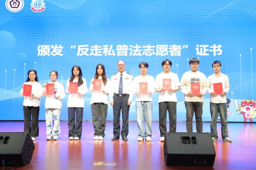 活动中,无锡海关缉私分局青年理论学习小组青年民警代表夏金源为我校“弘毅青年”反走私普法志愿服务团授旗。无锡海关缉私分局一级高级警长陈锡京为我校反走私普法志愿者颁发志愿者证书。校党委副书记吴开勇为无锡海关缉私分局的青年民警颁发“校外法治辅导员”聘书。